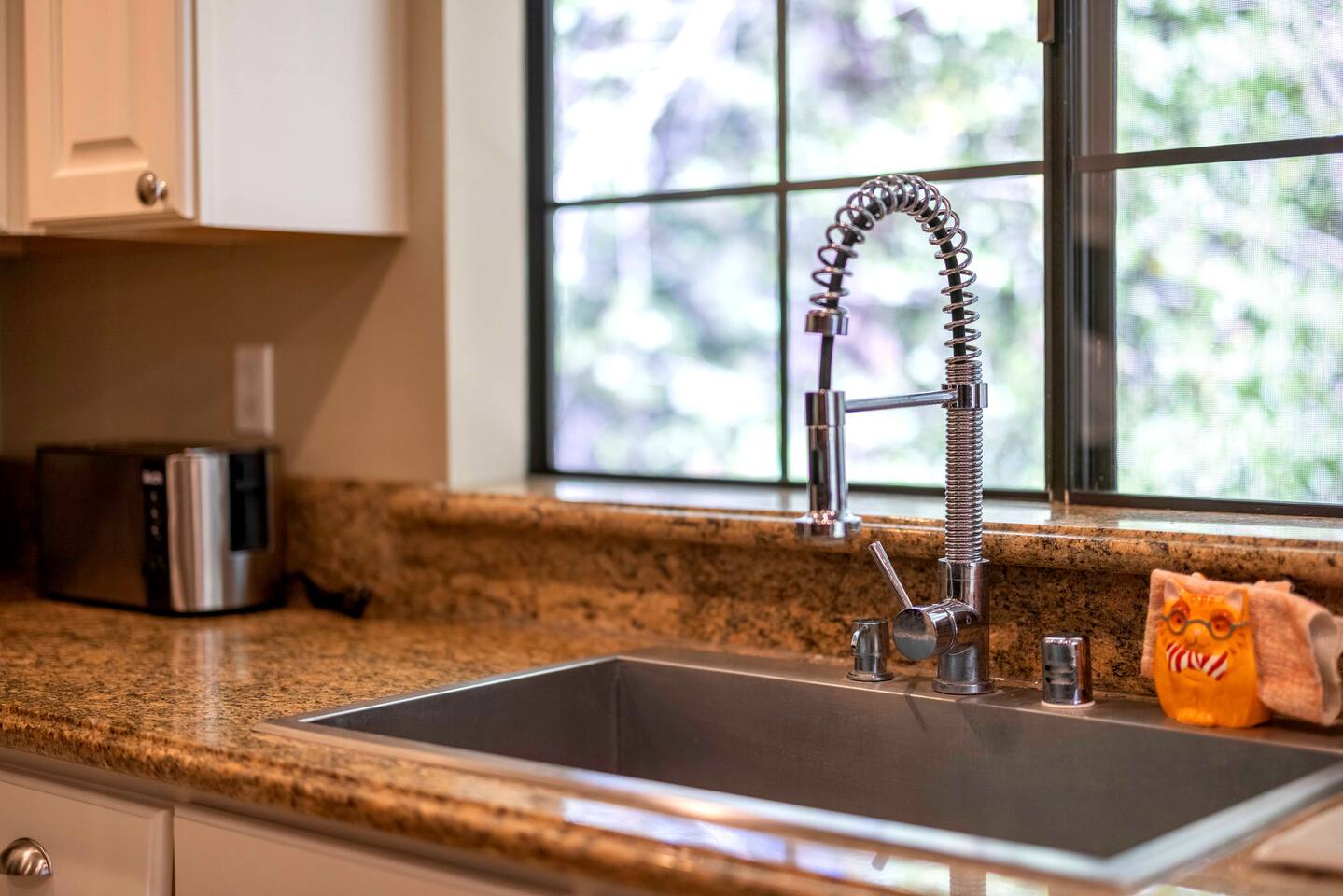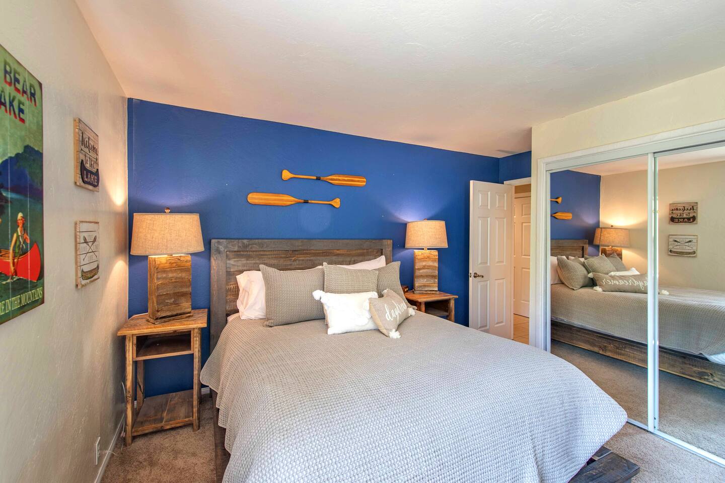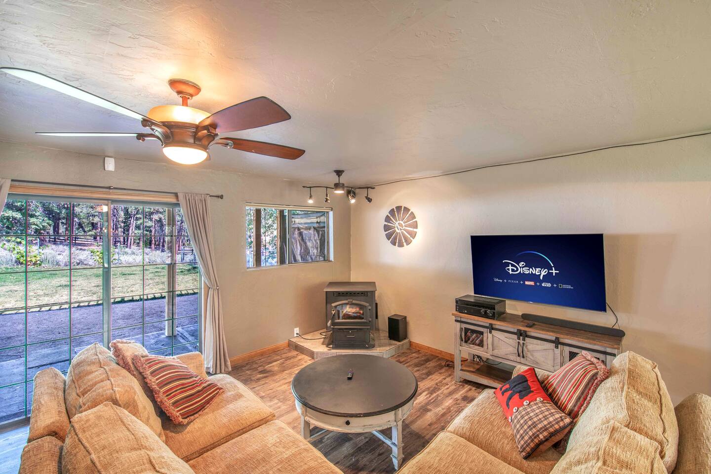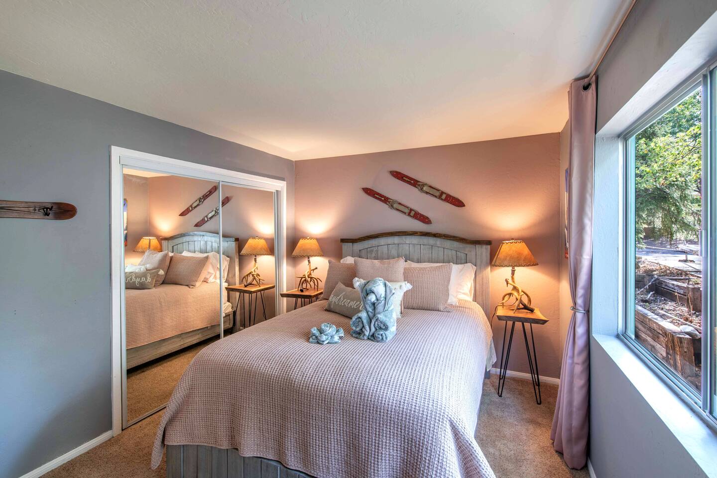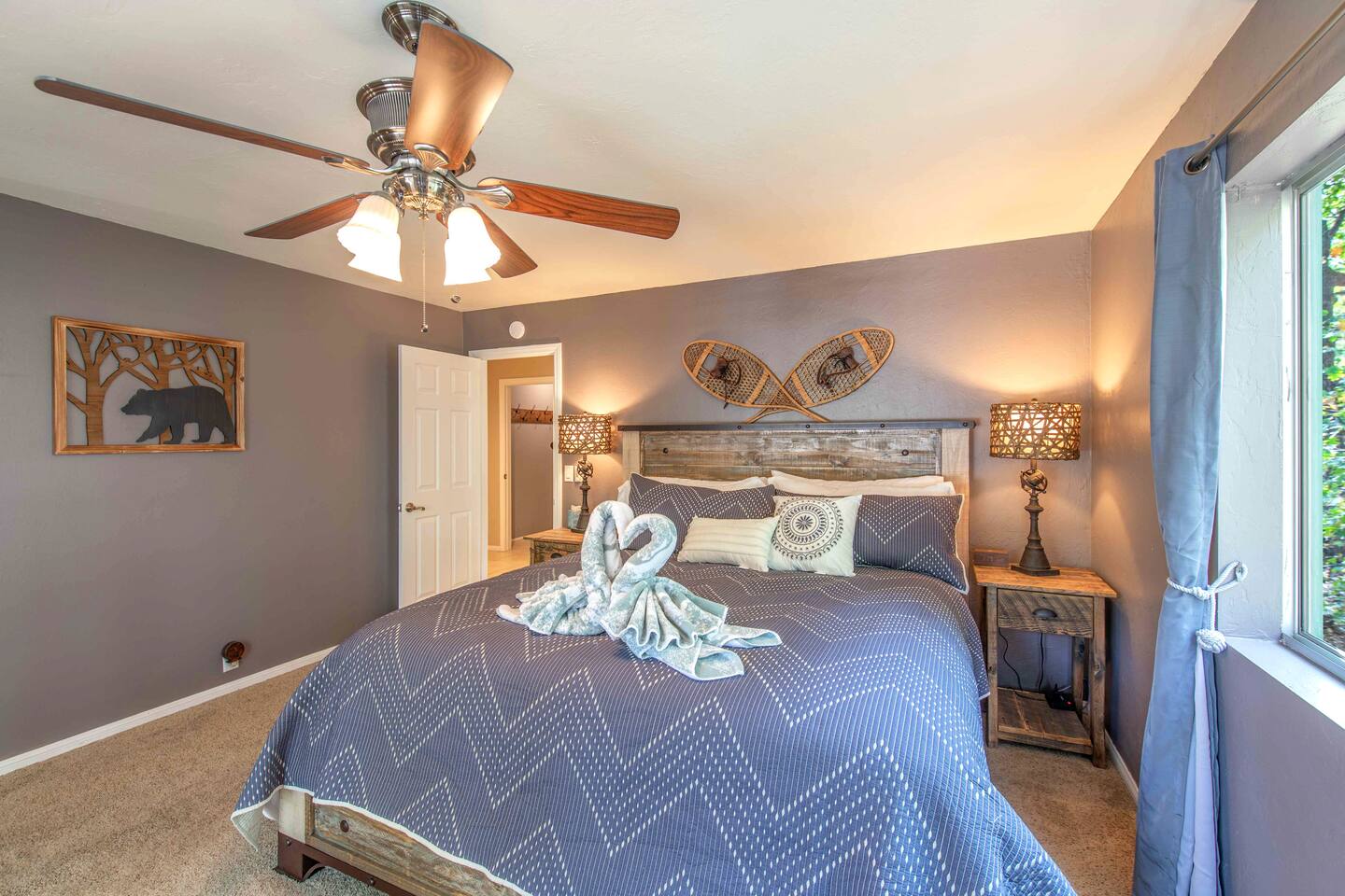 Welcome to Edelweiss Cabin! This hidden gem is nestled in the serene Fox Farm neighborhood of the Moonridge area, one of Big Bear's most desirable communities. Surrounded by lush trees, this pet-friendly retreat is perfect for a relaxing getaway. Enjoy modern amenities, stunning panoramic views, and plenty of space for your entire family including your furry friends! Very close to Bear Mountain and Snow Summit. Key Features: Spacious & Secluded: Situated on a large fenced lot with a massive backyard featuring a trampoline, this retreat is perfect for kids and pets to play. Parking is available for up to four vehicles. Entertainment for All Ages: Game room with a pool table, foosball, and smart TVs throughout the cabin. Enjoy free high-speed Wi-Fi and access to popular streaming services (please login with your own accounts). Relax and Unwind: Large upper deck with ample seating, a gas grill, a stand-up heating lamp, and a hot tub. Cabin Layout: Main Floor: Living Room: Open living area with a natural stone, wood-burning fireplace and large flat-screen TV. French doors open to the oversized deck with views of the lush forest, a brook, and a winding path. Dining Room: Features an elegant wood accent wall, with seating for eight. Direct access to the deck for outdoor dining. Kitchen: Fully stocked with updated appliances, including a double-door refrigerator with ice/water dispenser, Jen-Air gas cooktop, large farmhouse sink, under-cabinet microwave, coffee maker, and toaster. Plenty of counter space and a breakfast bar for extra seating. Bedroom 1 (Master Suite): King bed, wall-mounted TV, vanity with lighted mirror, ceiling fan, and double doors leading to the patio with a jacuzzi spa. Ensuite bathroom with a stylish hammered stainless steel sink and walk-in rain shower. Bedroom 2: Queen bed, lounging sofa, and scenic window views. Bedroom 3: Queen bed with cozy ambiance. Bathroom 2: Full bathroom with tub/shower combo. Laundry Room: Equipped with a newer washer and dryer. Safety: Stairway off the living area is gated to keep toddlers and pets safe. Downstairs: Game Room: All-new wood flooring, featuring a pool table, foosball, two TVs, and a bar area with stools. Downstairs Pellet stove is not functioning as of 2/14/25. Bedroom 4 (Kids’ Room): Four single beds in a bunk setup, low ceiling, and a wall-mounted TV—perfect for children. Bathroom 3: Conveniently located with a walk-in shower. Outdoor Space: Yard: Expansive, fenced, and wooded—ideal for family and pet adventures. Includes a sandy area with a trampoline (use at your own risk) and a seating area with a rattan outdoor table and chairs. Deck: Accessible from both the living area and the Master bedroom. Equipped with comfortable seating, a gas grill, a stand-up heating lamp, and a jacuzzi spa—perfect for relaxing under the stars. Additional Details: Non-family renters must be at least 25 years old. Two dogs maximum. Create Unforgettable Memories: Edelweiss Cabin offers a unique and tranquil setting for guests of all ages. Whether you're here for adventure or relaxation, this beautiful cabin promises an exceptional experience. Book now and make lasting memories with your loved ones! _____________________________________ Pets are welcome. Absolutely no smoking in or around the cabin. No parties allowed. Non-family renters must be at least 25 years old. For your safety, we have two security cameras installed. One is attached to the doorbell, and the other is a floodlight camera above the garage. We also have ONE (1) Minut decibel meter outside. 24/7” NOTE: Big Bear Lake local ordinance 99.300 limits maximum occupancy to 10 people & 4 parked cars. (Children, toddlers, and infants do count as a person.) Please do not book or arrive with more than the maximum or you could be fined from the city and evicted with no money back.