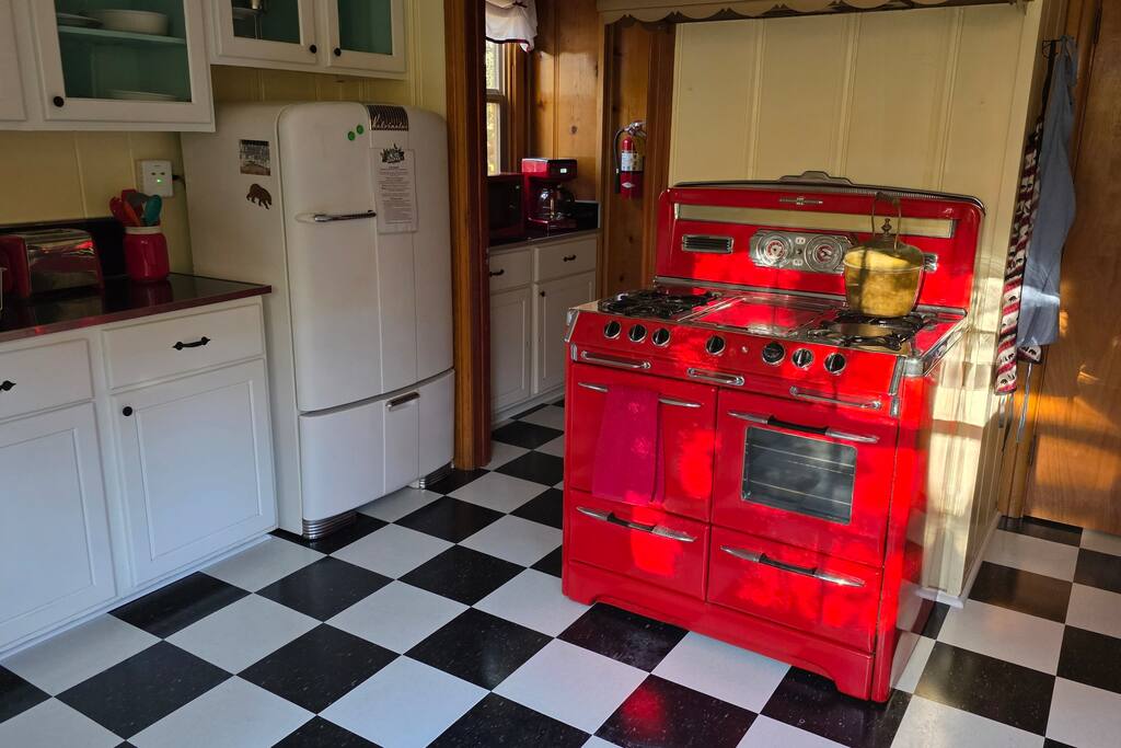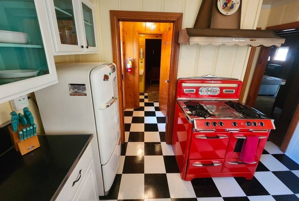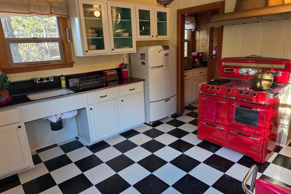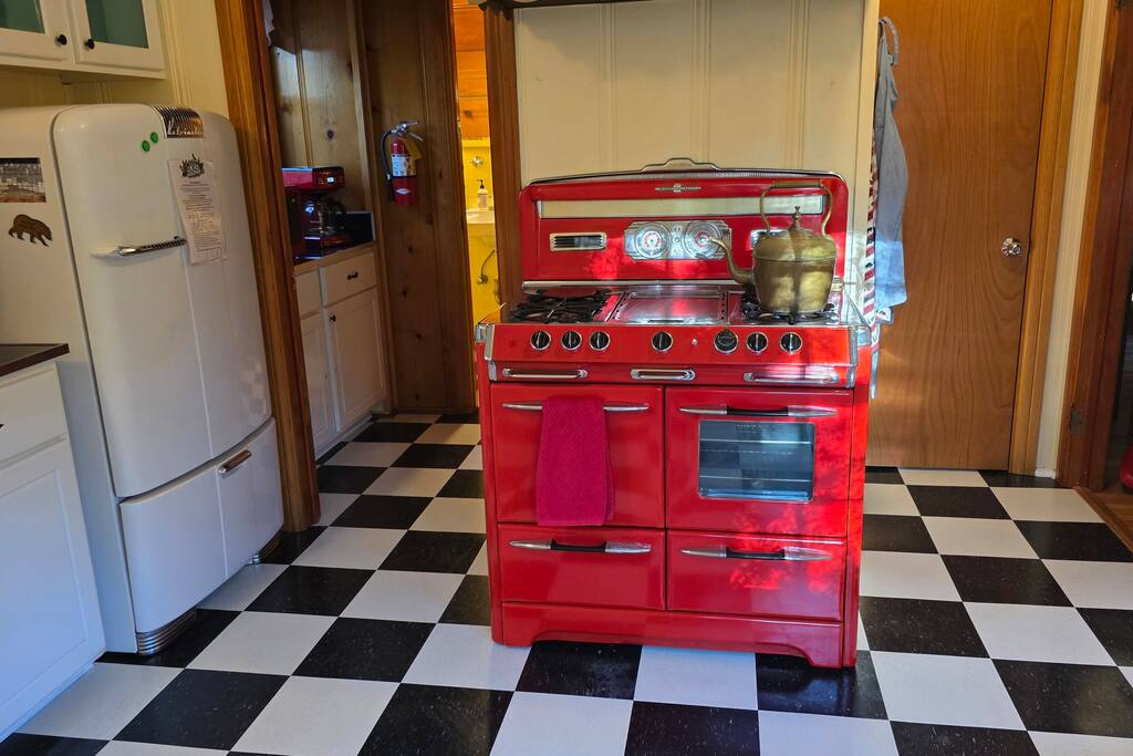 Update October 2025: New black and white 1950s style kitchen floor. Big yard great for snow play & relaxation! Down the street from Alpine Zoo, Moonridge Coffee, & Bear Mountain. Built in 1951 by a Hollywood set designer, Roni's Retreat is a special “time capsule” cabin that has original kitchen appliances, vintage light fixtures, and a gorgeous custom wood burning fireplace. Superb craftsmanship & retro charm! Located minutes from Big Bear Mountain Pets always stay for free!