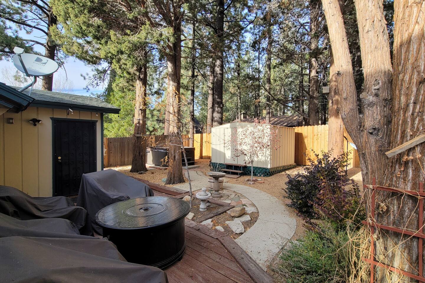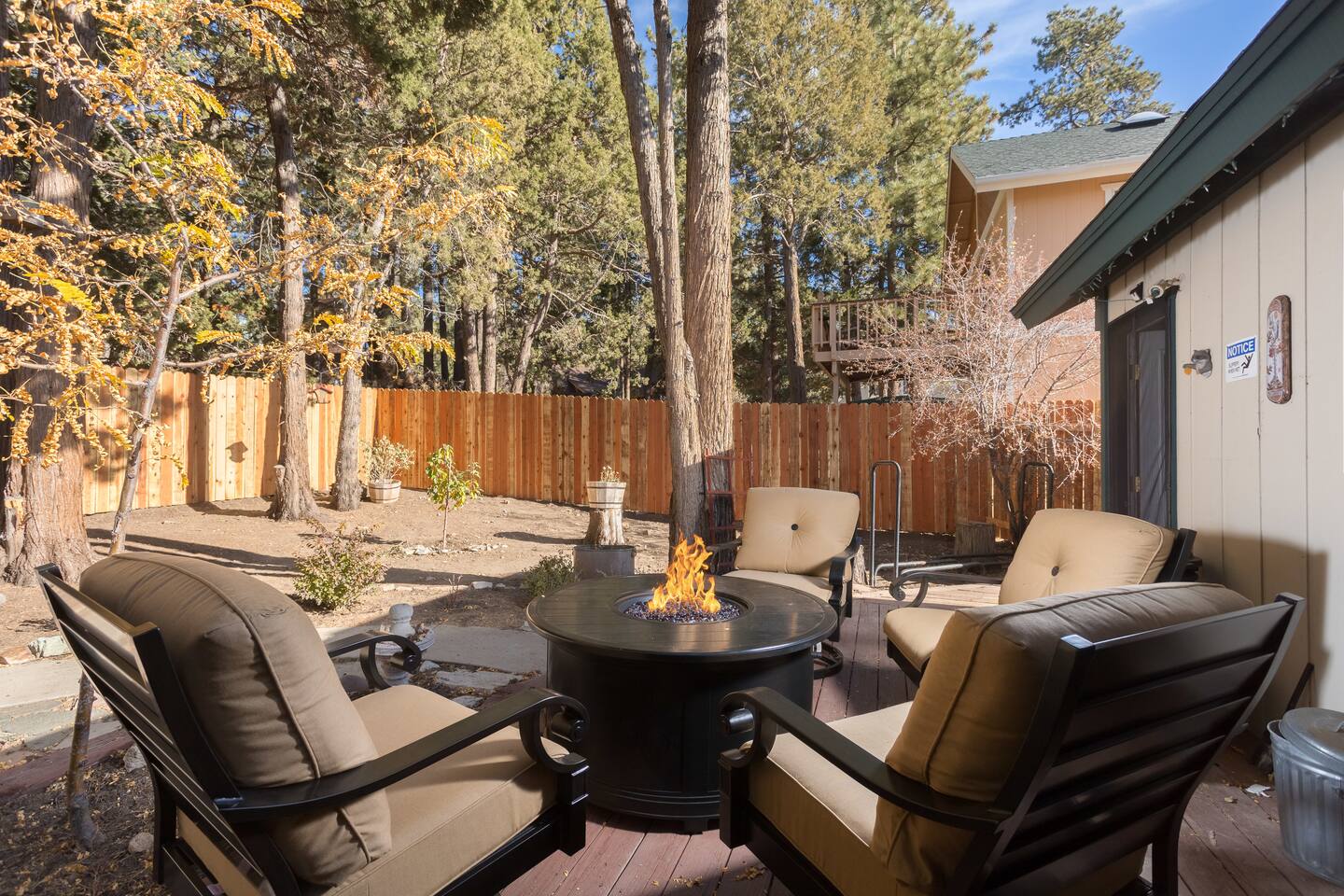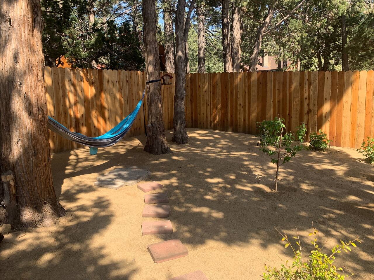 The Hot tub has been repaired as of August 2023 and is working great! . Big Bear Lake local ordinance 99.300 limits maximum occupancy to 5 people & 2 parked cars. (Children, toddlers, and infants do count as people.) Please do not book or arrive with more than the maximum or you could be fined from the city and evicted with no money back. Right down the street from Bear Mountain, cozy Moonridge Cabin has the perfect location and views, to the ski resorts and only minutes from Big Bear Village. Swing on the outdoor porch swing while enjoying the amazing ski mountain and golf course view while hearing all the animals in the new rescue zoo right down the street. Or head to the backyard and enjoy the privacy of your own hot tub (installed in 2019). This charming cozy amazing view cabin in Moonridge has 1 level, 2 bedrooms, 2 patios, 2 full bathrooms, and is located directly across the street from the Bear Mountain Golf Course’s 4th hole (on the sunny side of the golf course!). Moonridge Cabin features beautiful views of Bear Summit and is located right around the corner from Bear Mountain Ski Resort! This Big Bear getaway has a floor-to-ceiling rock fireplace (wood burning), central heating, free high speed Wi-Fi, TVs with Roku & Netflix, a master suite, separate laundry room, fully fenced backyard, & a hot tub. The kitchen is fully-stocked and all bedding & linens are provided by our professional cleaning crew. This rustic retreat is the perfect getaway for family, friends, & even pets! Two dog Maximum. ROOM DESCRIPTIONS * Front Patio: Moonridge Cabin has 2 patios. The front patio features an outdoor dining table for 4, porch swing, & BBQ grill. * Living Room: Open-concept living room with entry bench, TV with Roku, sitting area with sofa, & a floor-to-ceiling rock (wood burning) fireplace. * Kitchen: Open-concept kitchen with breakfast bar seating for 2, gas range, toaster, microwave, coffee maker, dishwasher, & refrigerator. * Dining Area: Open-concept dining area adjacent to the kitchen with dining table for 4-6 & entrance to back patio. * Bedroom #1 (Master Bedroom): Master bedroom with 1 king bed, dresser, TV with Roku, closet, & en-suite bathroom. * Bathroom #1 (Master Bathroom): Full en-suite master bathroom with a shower & jetted bath tub. * Laundry Room: Laundry room next to the master bedroom (Bedroom #1) with entrance to backyard and full size washer & dryer. * Bedroom #2: Bedroom with 1 queen bed, dresser, desk, TV with Roku, 1 bunk bed (2 twin beds), ceiling fan, closet, & beautiful views of the golf course. The bunk beds each have a maximum weight of 185 lbs. * Bathroom #2: Full bathroom next to the living room with hairdryer, shower, & bath tub. * Back Patio: Moonridge Cabin has 2 patios. The back patio features a fully fenced backyard complete with firepit, outdoor seating, & hot tub RECORDING DEVICE/ CAMERA DISCLOSURE: We have ONE (1) active doorbell (Ring) camera facing the entrance and the driveway. It is active 24/7 and records both sound and video for 30 seconds upon motion. It is on 24/7 during your stayTampering with, covering or disabling this device is a $250 fine. We also have a Minut decibel meter outside on the back deck. Minut is 100% privacy compliant- and cannot record conversations- it only reports noise levels so we have proof in case neighbors or Code Enforcement makes a complaint.