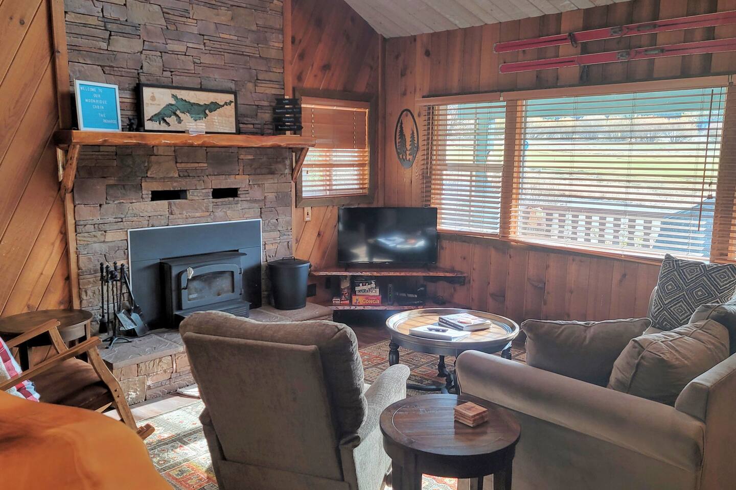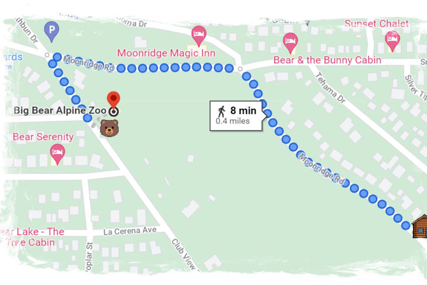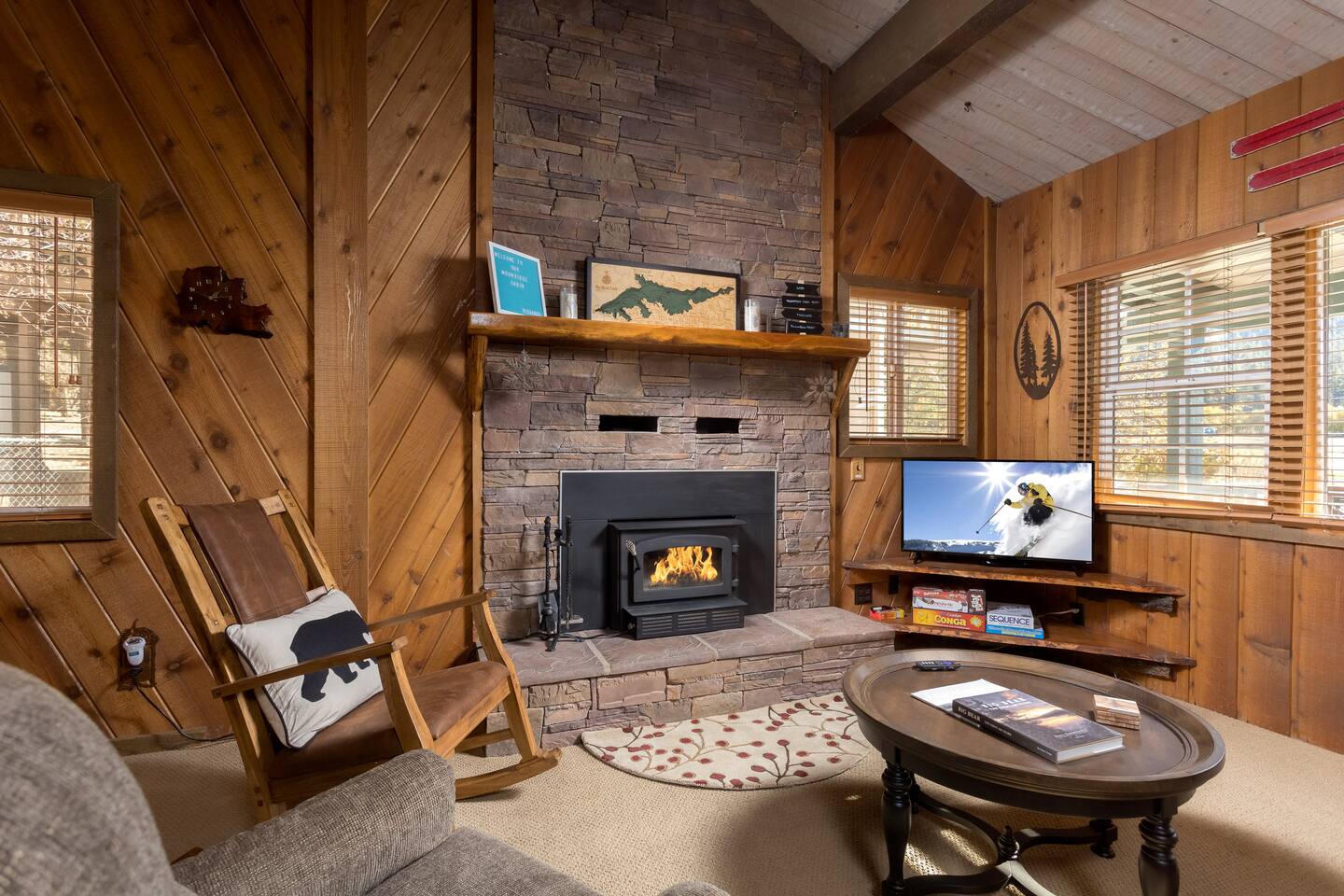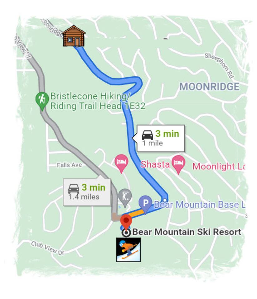 Moonridge Cabin is in the Lower Moonridge neighborhood of Big Bear & conveniently minutes from most activities - hiking, golfing (directly across the street!) , skiing, biking, swimming, & more. This rustic retreat is a quick 5 minute drive to Big Bear Village downtown shops & restaurants as well as the lake.