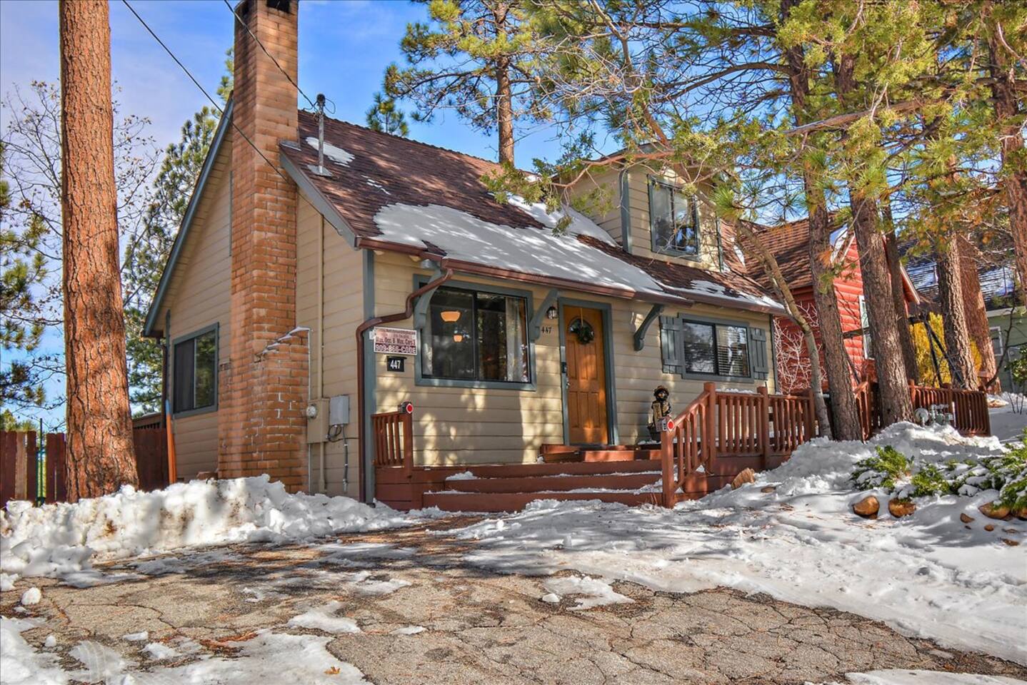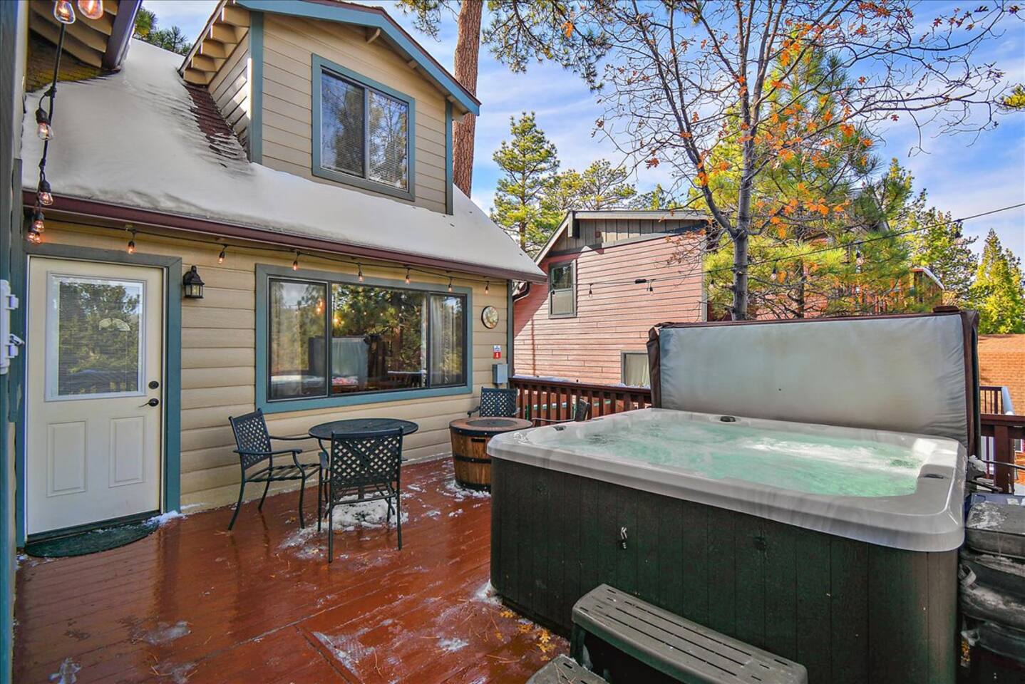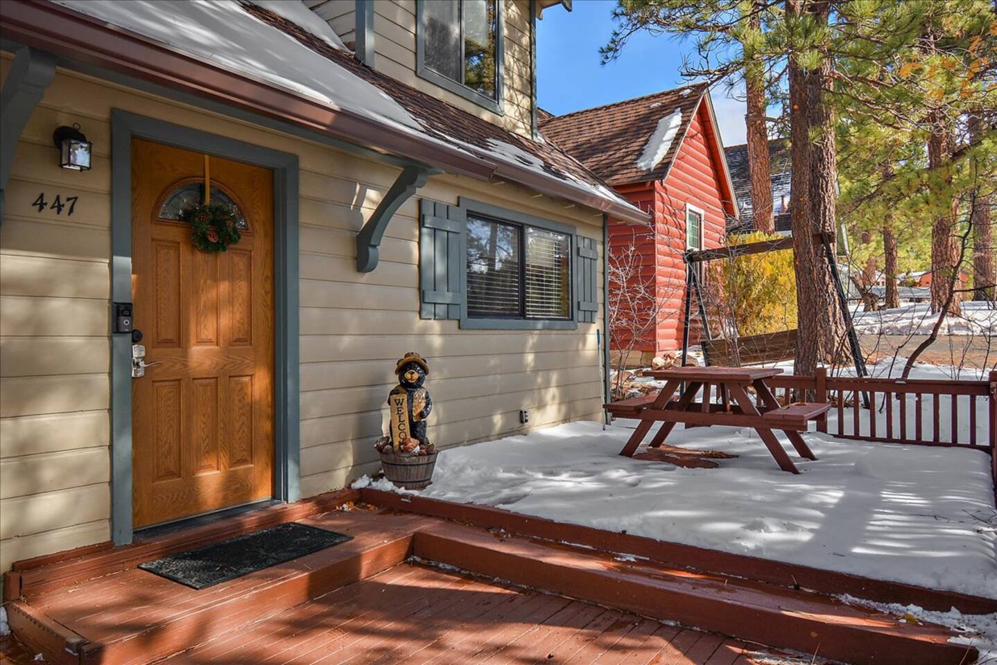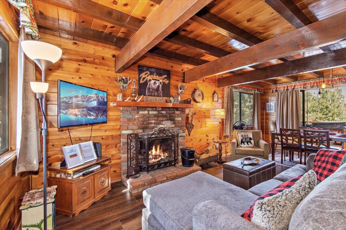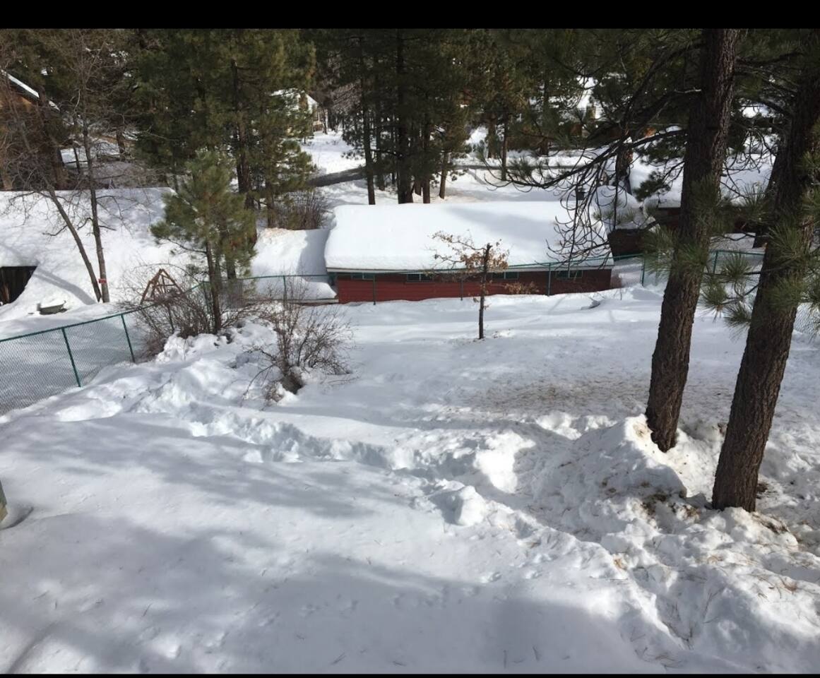 Welcome to the newly improved Vista De Oso! New owners added tons of updates- November 2022 including: - New Smart TVs in Living Rooms and bedrooms - New couch - Air fryer - Doggie bag dispenser with bags - New bedspreads, sheets, towels - New rugs - Newly Painted the decks - Propane firepit outside! We are limited to maximum occupancy to 6 people & 2 parked cars. (Children, toddlers, and infants do count as a person.) Please do not book or arrive with more than the maximum or you could be fined from the city and evicted with no money back. Two Dog Maximum. _____________________________________________ PLEASE NOTE: *The upstairs bedrooms are connected (Shared wall) but private- but you do have to walk thru the bunkbed room to get to the king bedroom UPDATE: Entire home has new wood flooring - installed in May 2021. ROOM DESCRIPTIONS * Living Room: Cozy and comfy wood walls, high wood-beamed ceilings- the wood-burning fireplace at the center of it all! This is what a cabin in Big Bear should be! Smart TV (Log into your own Netflix, Hulu, Disney+ accounts!) brand new plush, comfy couch and chair! * Dining Area: Open-concept dining area off the living room. Dining, game playing, puzzle solving for 6. The door leads to the back patio (Hot tub) * Kitchen: Gas range, toaster, microwave, coffee maker, dishwasher, washer, dryer, crockpot, refrigerator. Also just added a brand new air fryer. Full set of plates, silverware, dishes, glasses, mugs, plastic ware for the hot tub! * Bedroom #1 (Master Bedroom): This is downstairs off the living room. Master bedroom with 1 king bed & en-suite bathroom. Enjoy your favorite streaming service from the bedroom as well! * Bathroom #1 (Master Bathroom): Full en-suite master bathroom with toilet, sink, a shower & bathtub combo. This is the ONLY downstairs bathroom, and you must pass thru bedroom #1 to use it. * Laundry Room: Laundry is in the kitchen with a full-size washer & dryer. * Bedroom #2: Upstairs- Bedroom with twin over full bunk bed (THIS IS A PASS THRU BEDROOM!) You must walk thru this bedroom to get bedroom #3 * Bedroom #3: King Bed, 2 comfy seats with a table at the window with a peek-a-boo view of the lake. (You must walk thru bedroom #2 to get to this bedroom) Smart TV added in Nov 2022! * Bathroom #2: Upstairs at the top of the stairs- toilet, sink, shower. (no bathtub) * Outdoor Patios: Vista De Oso has 3 patios. The front patio features a picnic table. The back patio has a dining table, Hot Tub for 6, a wooden porch swing, and a Blackstone flat-top grill (We supply the propane). Enjoy a cozy evening by the firepit with peek-a-boo lake views. The upper back patio is our bistro patio with a small table and 2 chairs, treetop views, and a peek-a-boo lake view! * YARD: Huge backyard with a slight slope. All fenced in for dogs and snow play! We have a ring camera on the front door also have a Minut decibel meter outside on the back deck. Minut is 100% privacy compliant- and cannot record conversations- it only reports noise levels so we have proof in case neighbors or Code Enforcement makes a complaint.