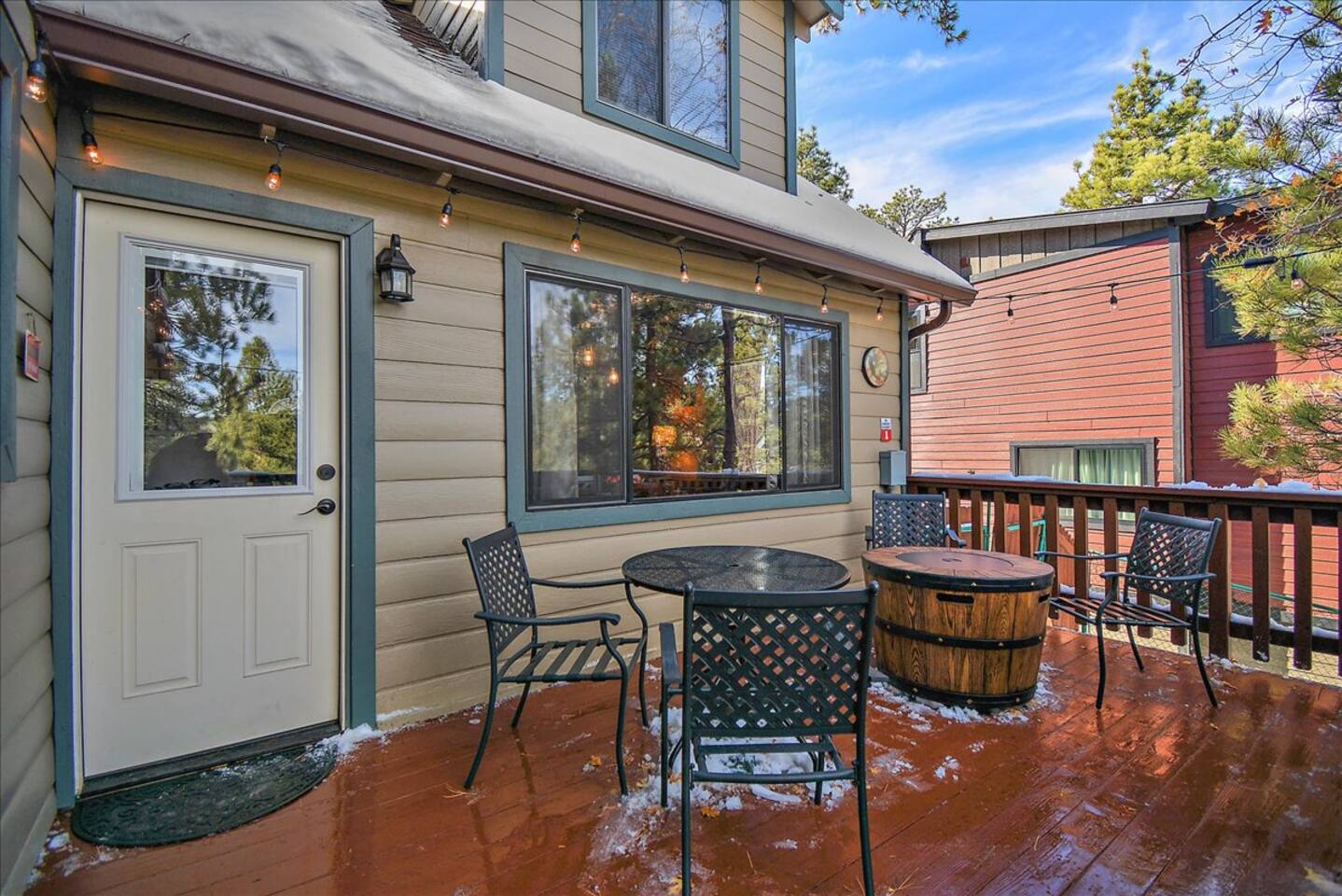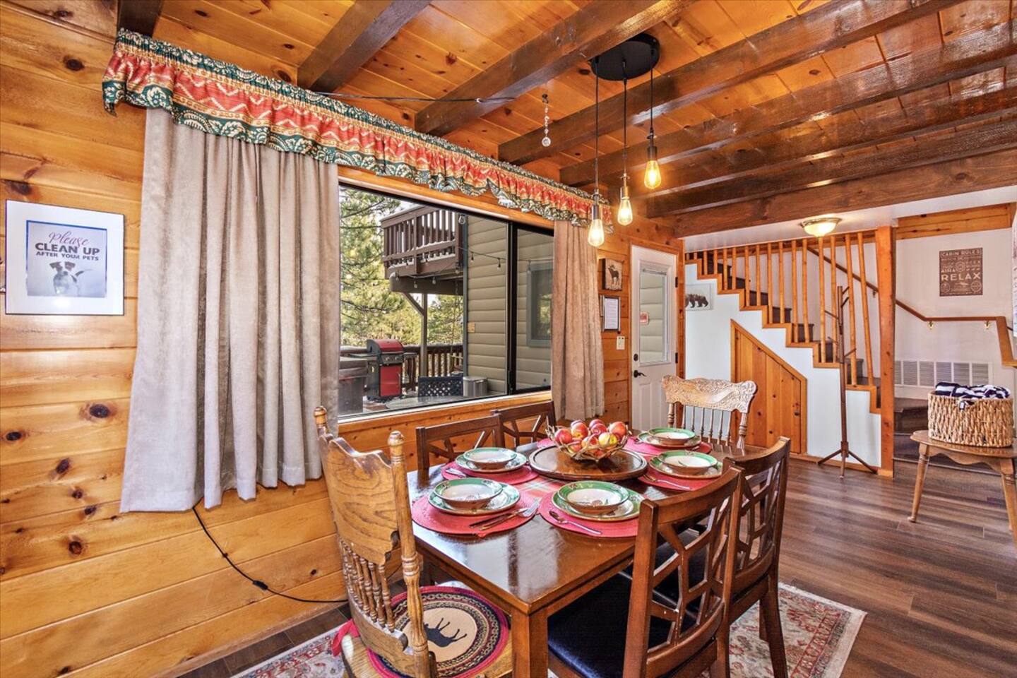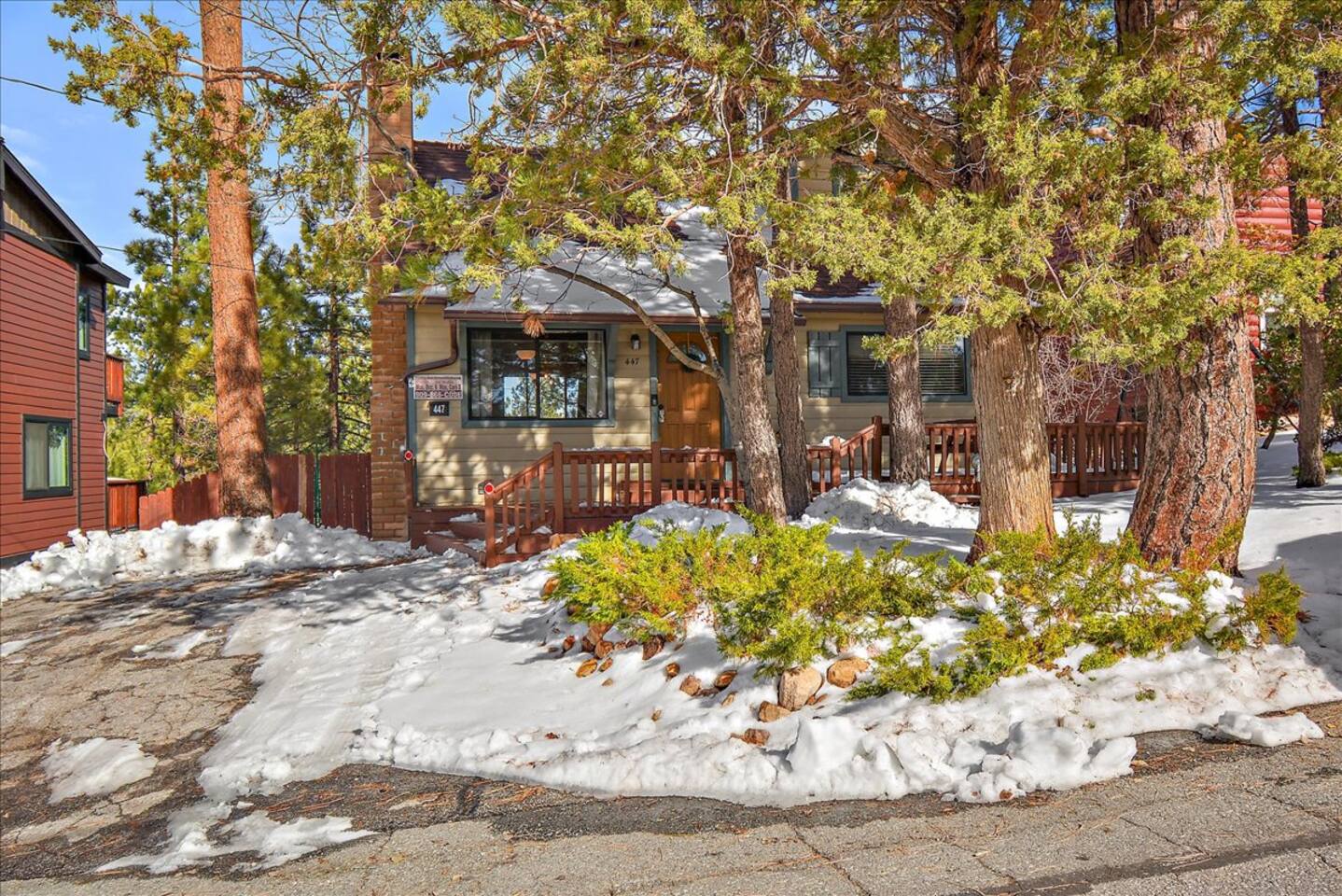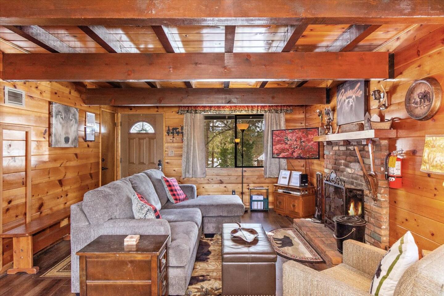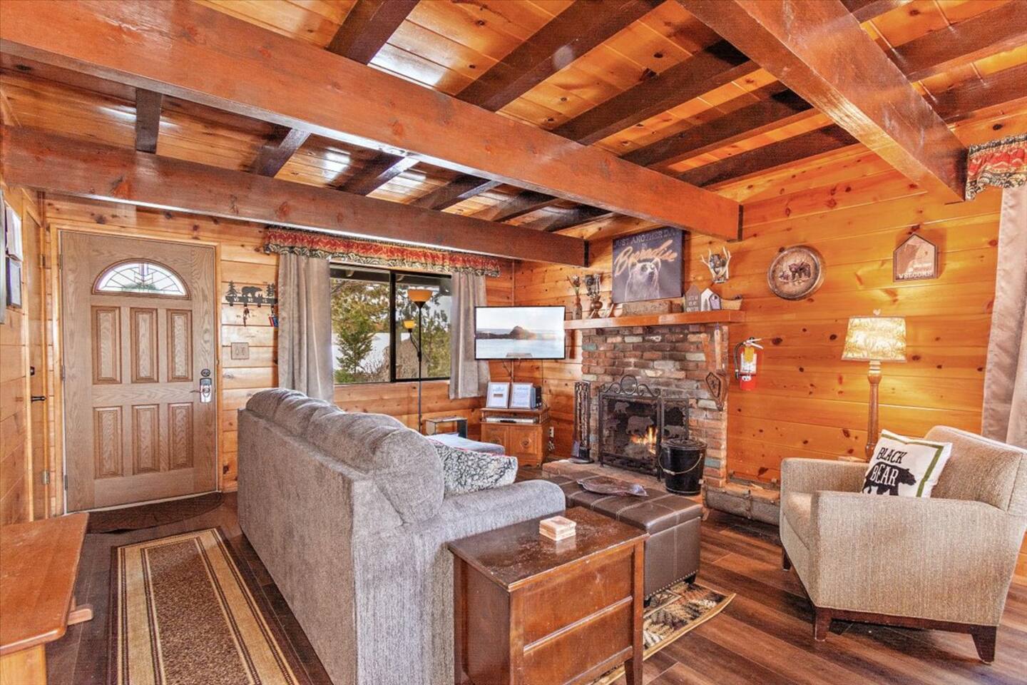 Welcome to the newly improved Vista De Oso! New owners added tons of updates- November 2022 including: - New Smart TVs in Living Rooms and bedrooms - New couch - Air fryer - Doggie bag dispenser with bags - New bedspreads, sheets, towels - New rugs - Newly Painted the decks - Propane firepit outside! We are limited to maximum occupancy to 6 people & 2 parked cars. (Children, toddlers, and infants do count as a person.) Please do not book or arrive with more than the maximum or you could be fined from the city and evicted with no money back. Two Dog Maximum. _____________________________________________ PLEASE NOTE: *The upstairs bedrooms are connected (Shared wall) but private- but you do have to walk thru the bunkbed room to get to the king bedroom UPDATE: Entire home has new wood flooring - installed in May 2021. ROOM DESCRIPTIONS * Living Room: Cozy and comfy wood walls, high wood-beamed ceilings- the wood-burning fireplace at the center of it all! This is what a cabin in Big Bear should be! Smart TV (Log into your own Netflix, Hulu, Disney+ accounts!) brand new plush, comfy couch and chair! * Dining Area: Open-concept dining area off the living room. Dining, game playing, puzzle solving for 6. The door leads to the back patio (Hot tub) * Kitchen: Gas range, toaster, microwave, coffee maker, dishwasher, washer, dryer, crockpot, refrigerator. Also just added a brand new air fryer. Full set of plates, silverware, dishes, glasses, mugs, plastic ware for the hot tub! * Bedroom #1 (Master Bedroom): This is downstairs off the living room. Master bedroom with 1 king bed & en-suite bathroom. Enjoy your favorite streaming service from the bedroom as well! * Bathroom #1 (Master Bathroom): Full en-suite master bathroom with toilet, sink, a shower & bathtub combo. This is the ONLY downstairs bathroom, and you must pass thru bedroom #1 to use it. * Laundry Room: Laundry is in the kitchen with a full-size washer & dryer. * Bedroom #2: Upstairs- Bedroom with twin over full bunk bed (THIS IS A PASS THRU BEDROOM!) You must walk thru this bedroom to get bedroom #3 * Bedroom #3: King Bed, 2 comfy seats with a table at the window with a peek-a-boo view of the lake. (You must walk thru bedroom #2 to get to this bedroom) Smart TV added in Nov 2022! * Bathroom #2: Upstairs at the top of the stairs- toilet, sink, shower. (no bathtub) * Outdoor Patios: Vista De Oso has 3 patios. The front patio features a picnic table. The back patio has a dining table, Hot Tub for 6, a wooden porch swing, and a Blackstone flat-top grill (We supply the propane). Enjoy a cozy evening by the firepit with peek-a-boo lake views. The upper back patio is our bistro patio with a small table and 2 chairs, treetop views, and a peek-a-boo lake view! * YARD: Huge backyard with a slight slope. All fenced in for dogs and snow play! We have a ring camera on the front door also have a Minut decibel meter outside on the back deck. Minut is 100% privacy compliant- and cannot record conversations- it only reports noise levels so we have proof in case neighbors or Code Enforcement makes a complaint.