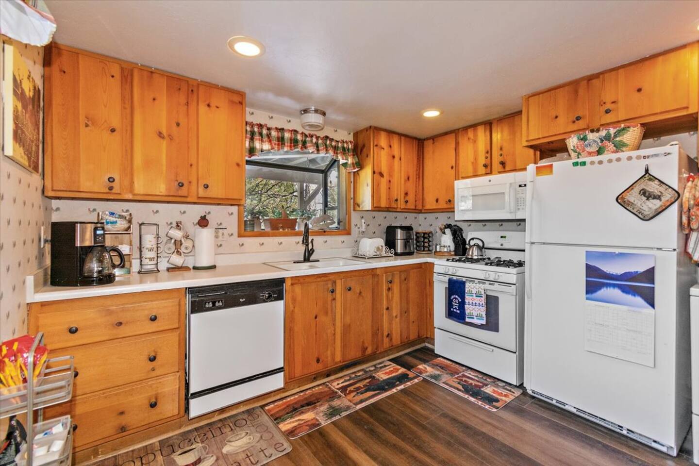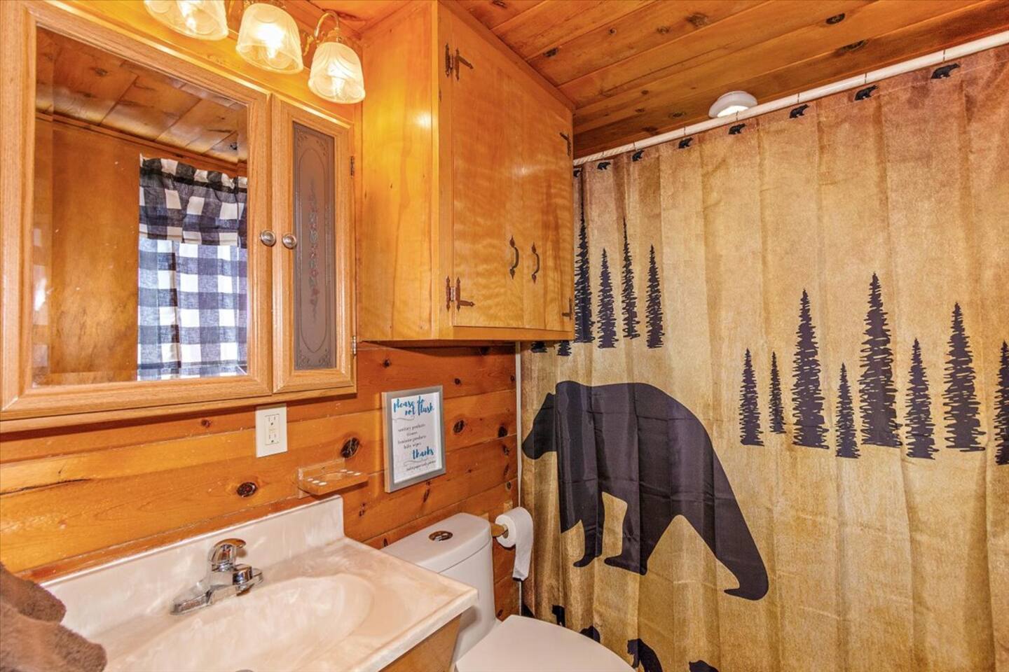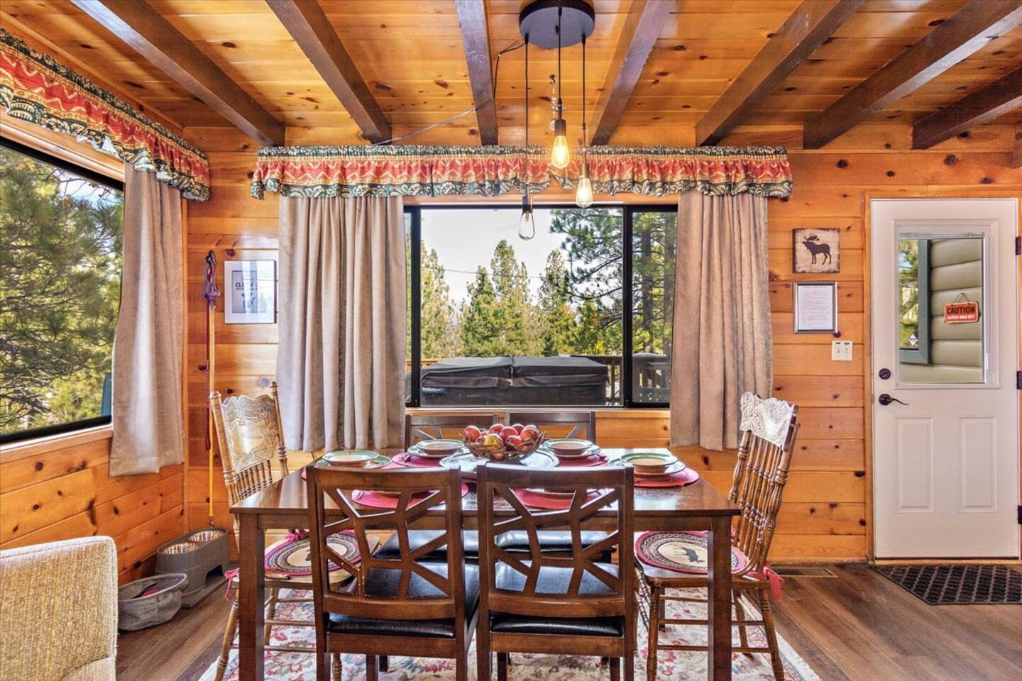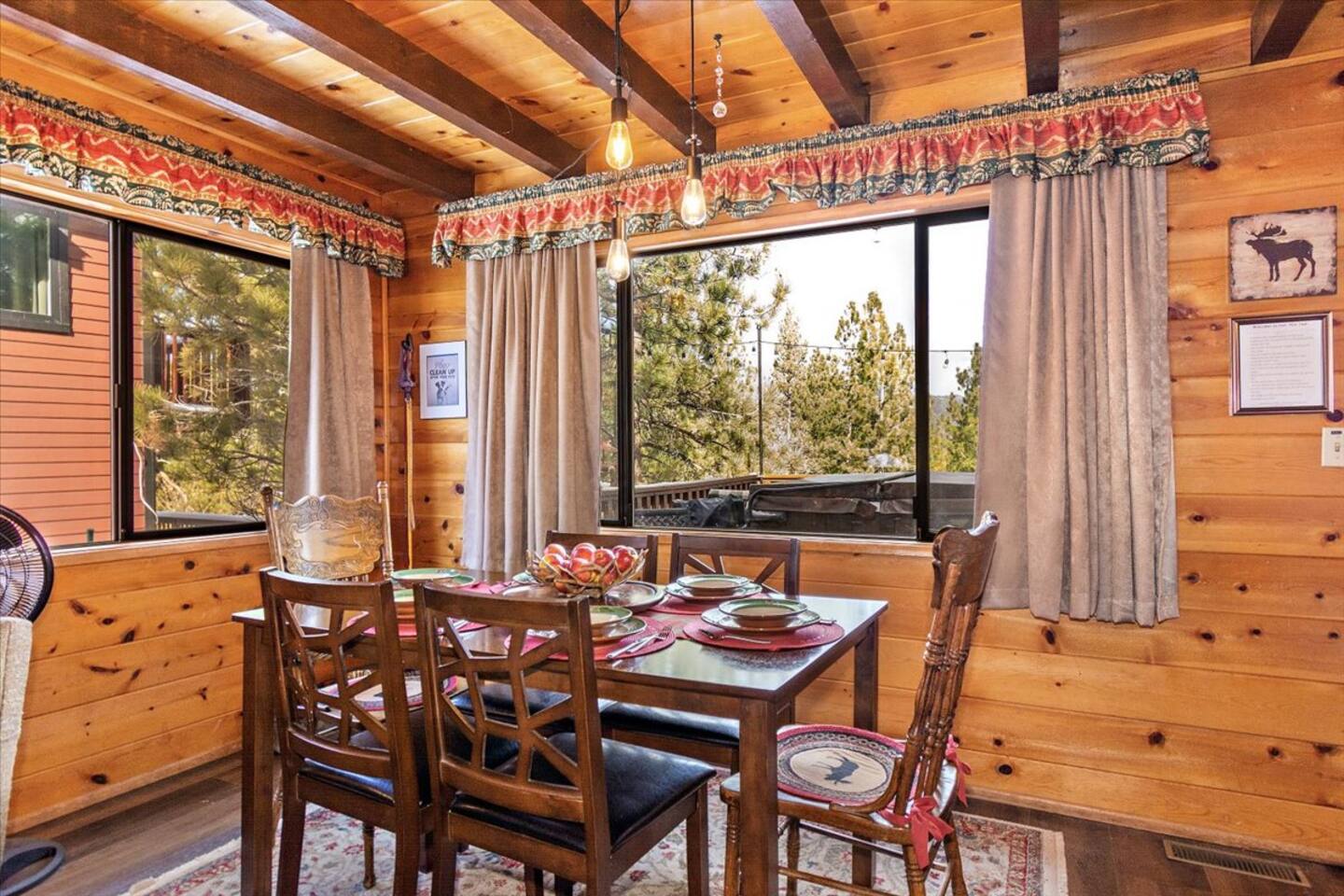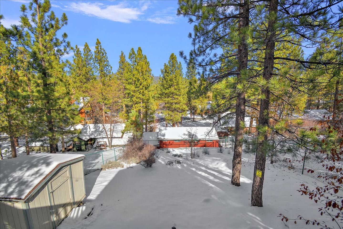 Welcome to the newly improved Vista De Oso! New owners added tons of updates- November 2022 including: - New Smart TVs in Living Rooms and bedrooms - New couch - Air fryer - Doggie bag dispenser with bags - New bedspreads, sheets, towels - New rugs - Newly Painted the decks - Propane firepit outside! We are limited to maximum occupancy to 6 people & 2 parked cars. (Children, toddlers, and infants do count as a person.) Please do not book or arrive with more than the maximum or you could be fined from the city and evicted with no money back. Two Dog Maximum. _____________________________________________ PLEASE NOTE: *The upstairs bedrooms are connected (Shared wall) but private- but you do have to walk thru the bunkbed room to get to the king bedroom UPDATE: Entire home has new wood flooring - installed in May 2021. ROOM DESCRIPTIONS * Living Room: Cozy and comfy wood walls, high wood-beamed ceilings- the wood-burning fireplace at the center of it all! This is what a cabin in Big Bear should be! Smart TV (Log into your own Netflix, Hulu, Disney+ accounts!) brand new plush, comfy couch and chair! * Dining Area: Open-concept dining area off the living room. Dining, game playing, puzzle solving for 6. The door leads to the back patio (Hot tub) * Kitchen: Gas range, toaster, microwave, coffee maker, dishwasher, washer, dryer, crockpot, refrigerator. Also just added a brand new air fryer. Full set of plates, silverware, dishes, glasses, mugs, plastic ware for the hot tub! * Bedroom #1 (Master Bedroom): This is downstairs off the living room. Master bedroom with 1 king bed & en-suite bathroom. Enjoy your favorite streaming service from the bedroom as well! * Bathroom #1 (Master Bathroom): Full en-suite master bathroom with toilet, sink, a shower & bathtub combo. This is the ONLY downstairs bathroom, and you must pass thru bedroom #1 to use it. * Laundry Room: Laundry is in the kitchen with a full-size washer & dryer. * Bedroom #2: Upstairs- Bedroom with twin over full bunk bed (THIS IS A PASS THRU BEDROOM!) You must walk thru this bedroom to get bedroom #3 * Bedroom #3: King Bed, 2 comfy seats with a table at the window with a peek-a-boo view of the lake. (You must walk thru bedroom #2 to get to this bedroom) Smart TV added in Nov 2022! * Bathroom #2: Upstairs at the top of the stairs- toilet, sink, shower. (no bathtub) * Outdoor Patios: Vista De Oso has 3 patios. The front patio features a picnic table. The back patio has a dining table, Hot Tub for 6, a wooden porch swing, and a Blackstone flat-top grill (We supply the propane). Enjoy a cozy evening by the firepit with peek-a-boo lake views. The upper back patio is our bistro patio with a small table and 2 chairs, treetop views, and a peek-a-boo lake view! * YARD: Huge backyard with a slight slope. All fenced in for dogs and snow play! We have a ring camera on the front door also have a Minut decibel meter outside on the back deck. Minut is 100% privacy compliant- and cannot record conversations- it only reports noise levels so we have proof in case neighbors or Code Enforcement makes a complaint.